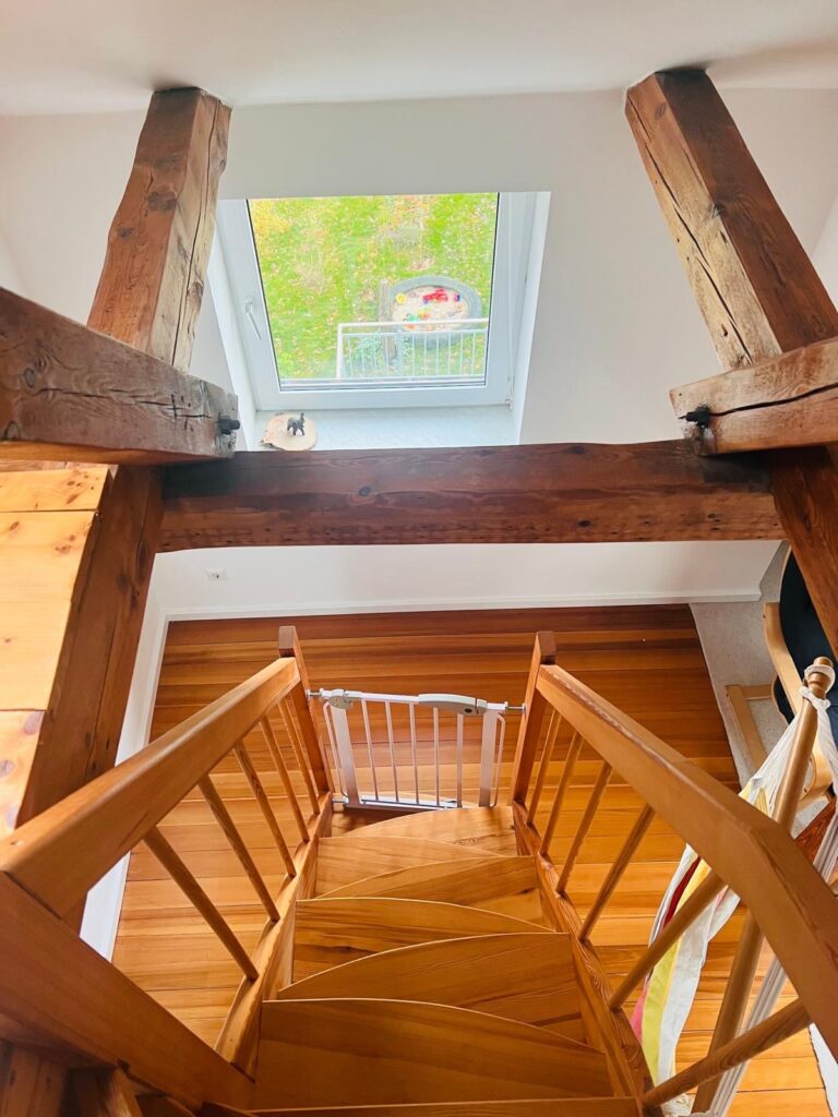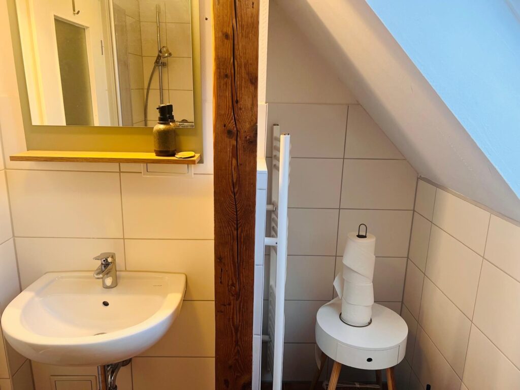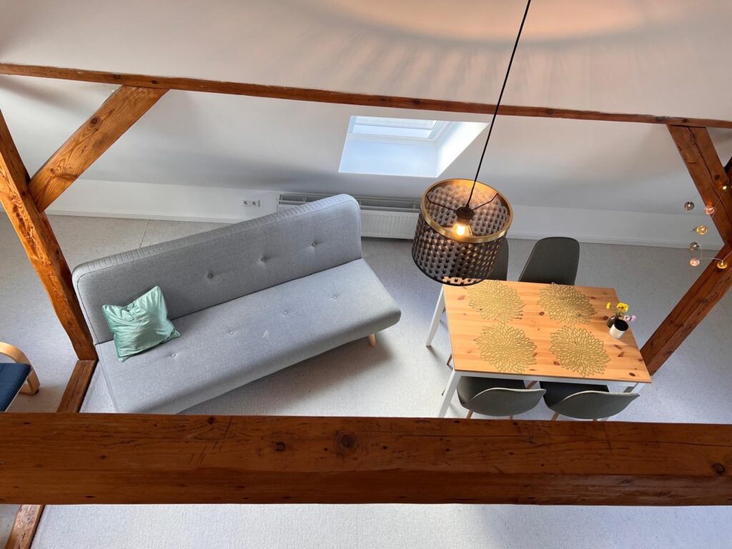 In der gemütlichen Dachgeschosswohnung habt ihr über zwei Etagen Raum für einen besonderen Urlaub. Die liebevoll eingerichtete Unterkunft bietet Platz für 1-6 Gäste. Das gemütliche Nest verfügt über einen Spitzboden mit einem Doppelbett, dass über eine Treppe erreichbar ist, eine Schlafcouch und eine Küche mit Esstisch. In einem separaten kleinen Zimmer befinden sich zwei Einzelbetten.